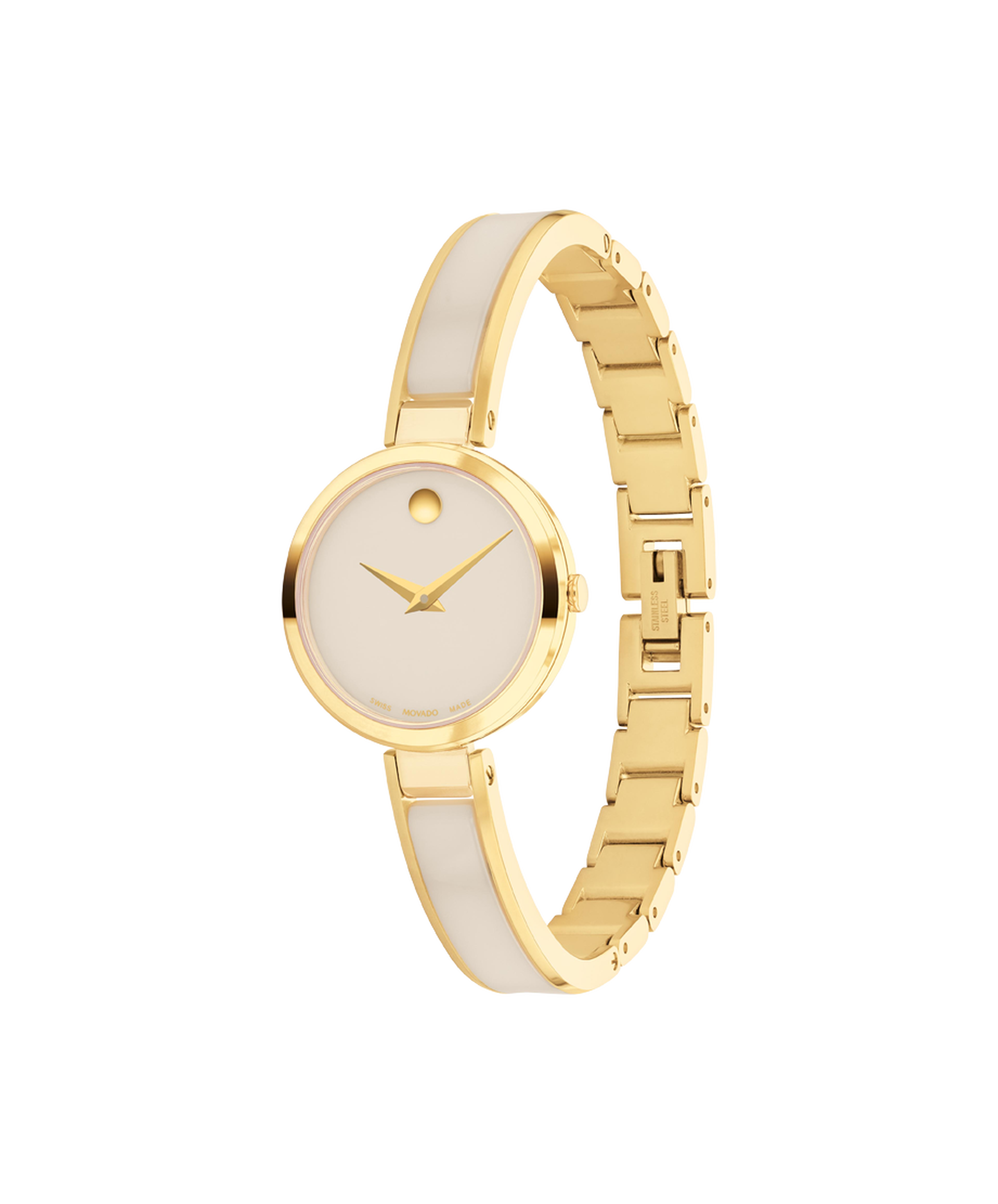 The Moda is defined by a slim, jewelry-inspired bracelet and our iconic Museum Dial. This 24mm watch features a lacquered taupe dial, yellow goldtone dauphine hands, and a ceramic-inlay bangle bracelet.